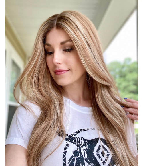 This is a long and wavy brown hair with blonde highlights.